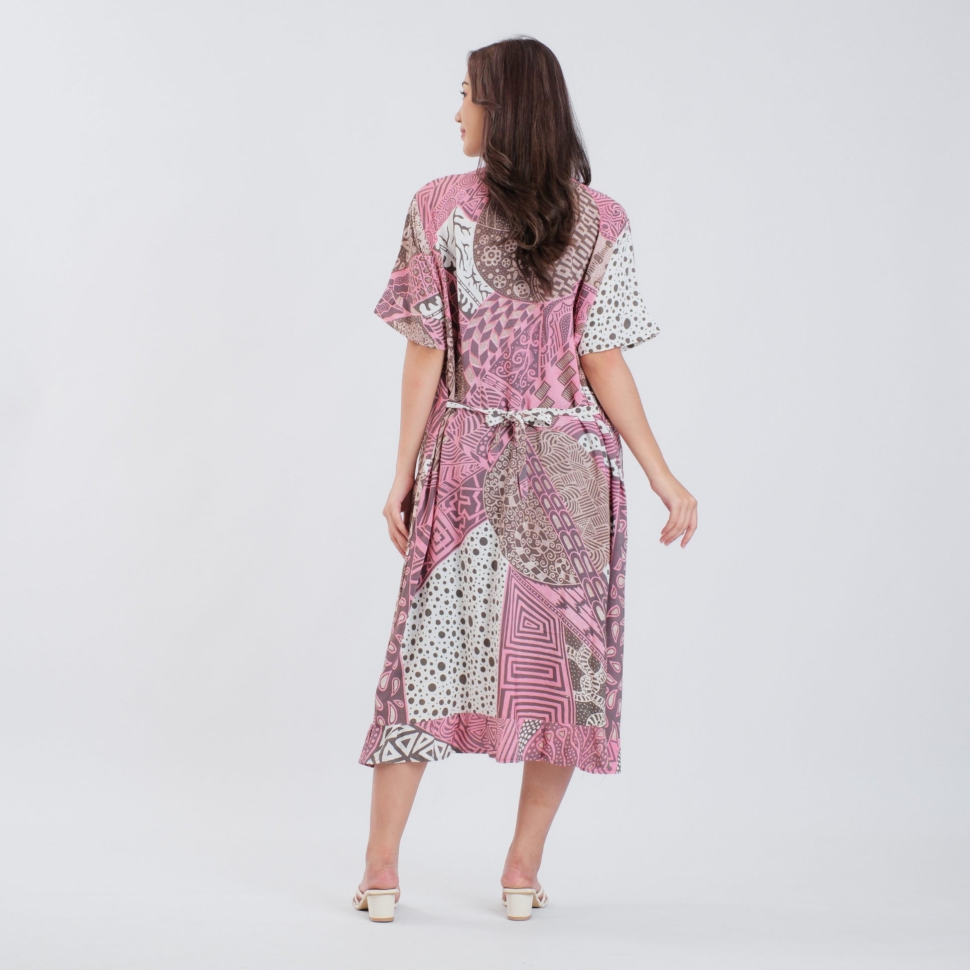 - Fitur: Kancing depan, lengan ruffle, saku sisi kanan, tali pinggang belakang.