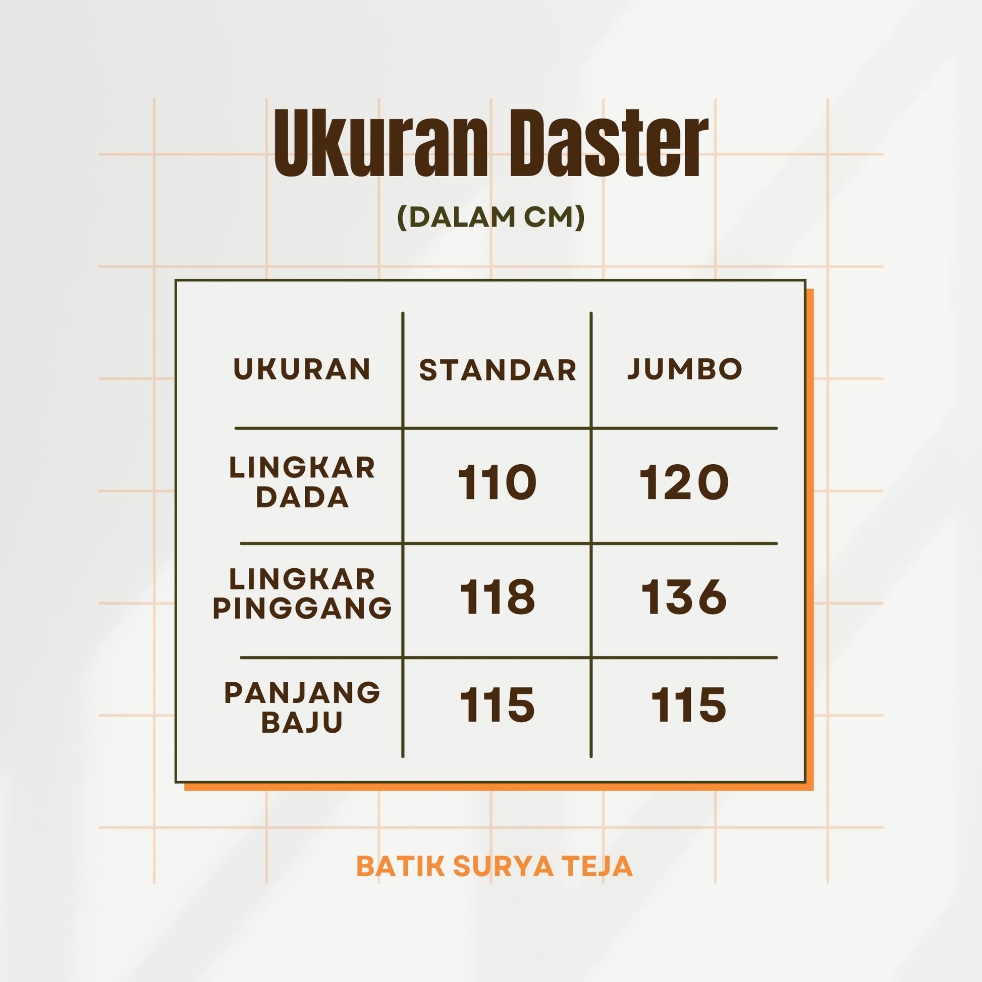 - Jumbo: Lingkar Dada 120 cm, Lingkar Pinggang 136 cm, Panjang Baju 115 cm