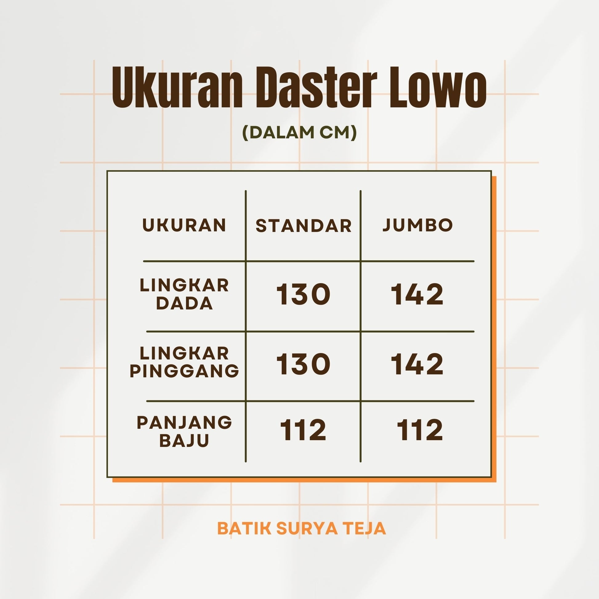 - Jumbo: Lingkar Dada 142 cm, Lingkar Pinggang 142 cm, Panjang Baju 112 cm